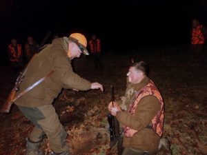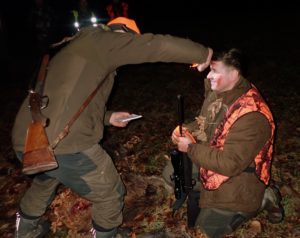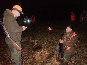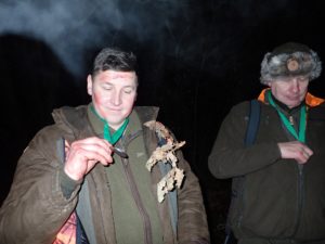 Pokot przedstawiał się zacnie. Byk jelenia, sześć dzików, koza oraz trzy lisy ułożone równo, na prawym boku, uczestnicy polowania oddający hołd upolowanej zwierzynie, ciepły blask ognisk, dźwięki rogów i miła uroczystość – chrzest myśliwski Macieja Mrówczyńskiego. Oj, podarzył mu dziś Święty Hubert dzikami.